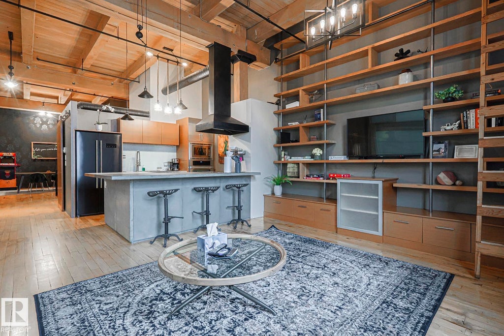 MODERN URBAN LOFT STYLE ARCHITECTURE. If your are looking for unique space in the heart of Downtown, this loft is a must see. Over 1,776 sq ft on two levels of fully developed contemporary living space featuring exposed brick, concrete, 13 foot ceilings, hardwood floors, in-suite laundry, and more. Total of two bedrooms, two bathrooms. Stylish kitchen with concrete countertops and modern cabinets. Underground heated and secured parking. Walking distance to hockey arena, restaurants, farmers market, and Ice District with future LRT station conveniently located next to the building.